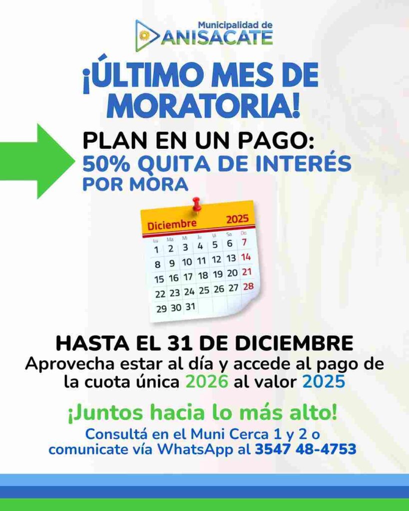 La Municipalidad de Anisacate informa a los vecinos que en diciembre también podrán adherirse al plan de moratoria de tasas municipales. Ello les permitirá poder acceder al beneficio de abonar el 2026 al mismo valor 2025. Para la moratoria hay tiempo hasta el 31 de diciembre y la propuesta ofrece exclusivos planes de pago. Por ejemplo: Pago de Contado: Con la quita del 50% de descuento sobre los intereses.