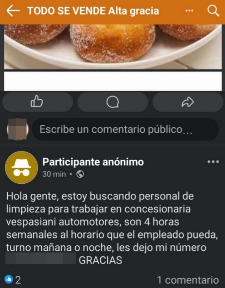 “El problema fue que pusieron mi número particular y me cansaron a mensajes”, relató el vecino afectado, quien explicó que la publicación fue hecha en el grupo de Facebook “TODO SE VENDE Alta Gracia”, donde se difundió una supuesta búsqueda laboral con su contacto personal.