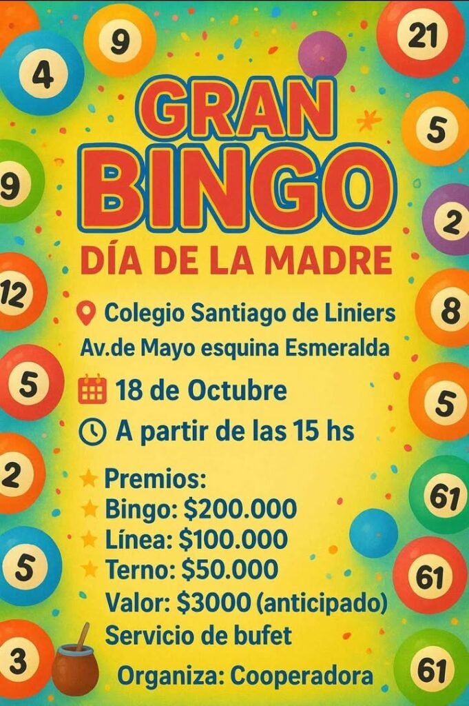El próximo sábado 18 de octubre, el Colegio Santiago de Liniers, ubicado en Avenida de Mayo esquina Esmeralda, será el escenario del Gran Bingo del Día de la Madre, un evento organizado por la cooperadora escolar con el objetivo de seguir mejorando las instalaciones del establecimiento.