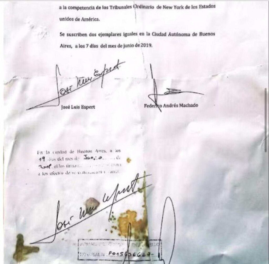 El contrato por un millón de dólares entre José Luis Espert y el empresario Federico «Fred» Machado fue encontrado en un tacho de basura en la casa de Viedma. Domicilio donde el hombre de negocios, acusado de narcotráfico, cumplía prisión domiciliaria a la espera de su extradición a Estados Unidos.