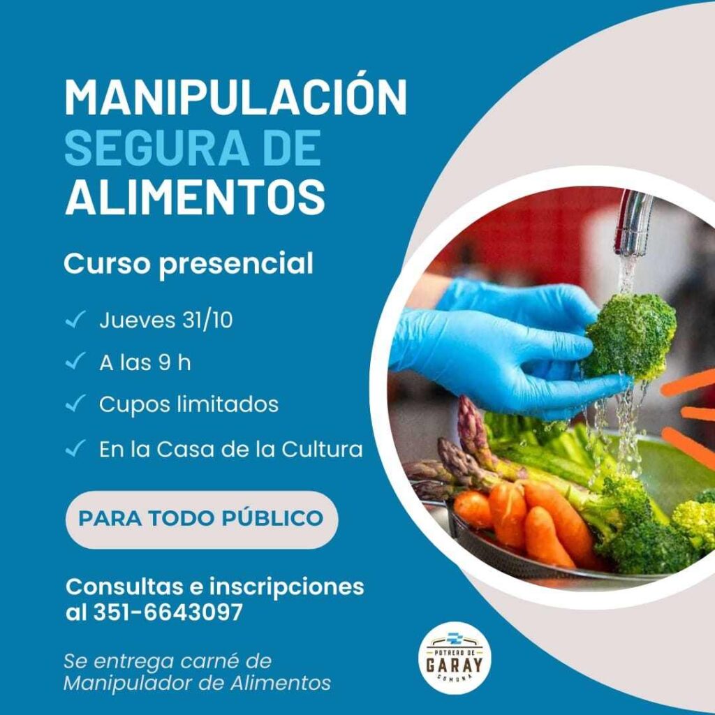 El Área de Bromatología de la Comuna de Potrero de Garay informa que se encuentra abierta la Inscripción para el Curso Presencial de Manipulación Segura de Alimentos.