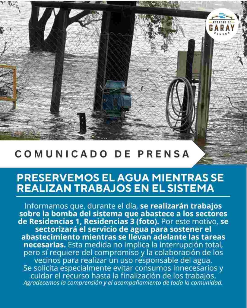 Esta apelación a los vecinos indica que «informamos que durante el día se realizarán trabajos sobre la bomba del sistema que abastece a los sectores de Residencias 1 y Residencias 3. Por este motivo se sectorizará el servicio de agua para sostener el abastecimiento mientras se llevan adelante las tareas necesarias».