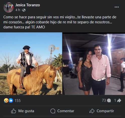 El crimen de Toranzo desató una serie de mensajes en redes sociales. El mensaje más sentido lo escribió su hija Jesica: