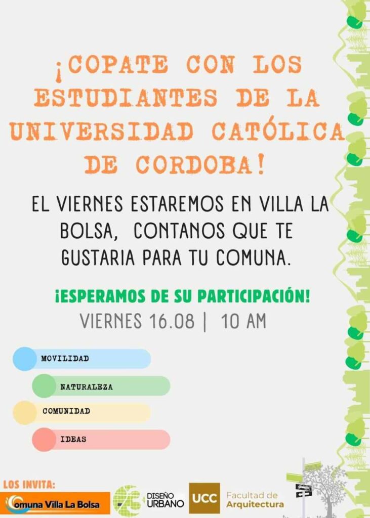 El próximo viernes, estudiantes de la Facultad de Arquitectura de la Universidad Católica de Córdoba estarán presentes en Villa La Bolsa. El objetivo: escuchar a los vecinos.