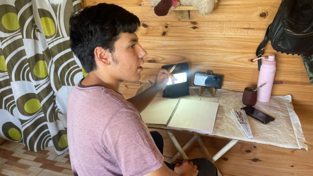 “Significaría un golpe bajo para mí dejar los estudios. Pero me imagino la idea de estar graduado, sería un gran logro”, remarcó Gonzalo, entre lágrimas. Al no contar con luz en su casa, al joven se le dificulta estudiar de noche.